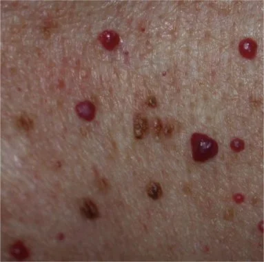 These red dots and spots can appear on the face, torso & limbs and are referred to under several names as; Blood Spots, Cherry Angioma or Campbell De Morgan Spots.
